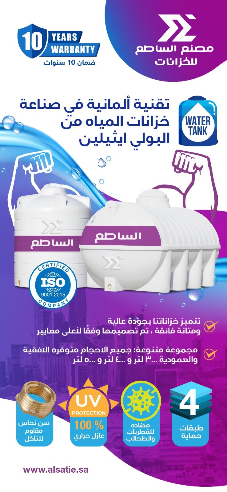 مصنع الساطع للخزانات تواصل معنا من نحن مصنع الساطع الاسم العريق الذي توارثه الاجيال في عالم صناعة الخزانات المياه والتي تعد فخر الصناعة الوطنية السعودية يحوي مصنع السلام احدث المعدات والآلات والمواد المستخدمة في التصنيع المبنية على الفهم الواضح لاحتياجات عملائنا
